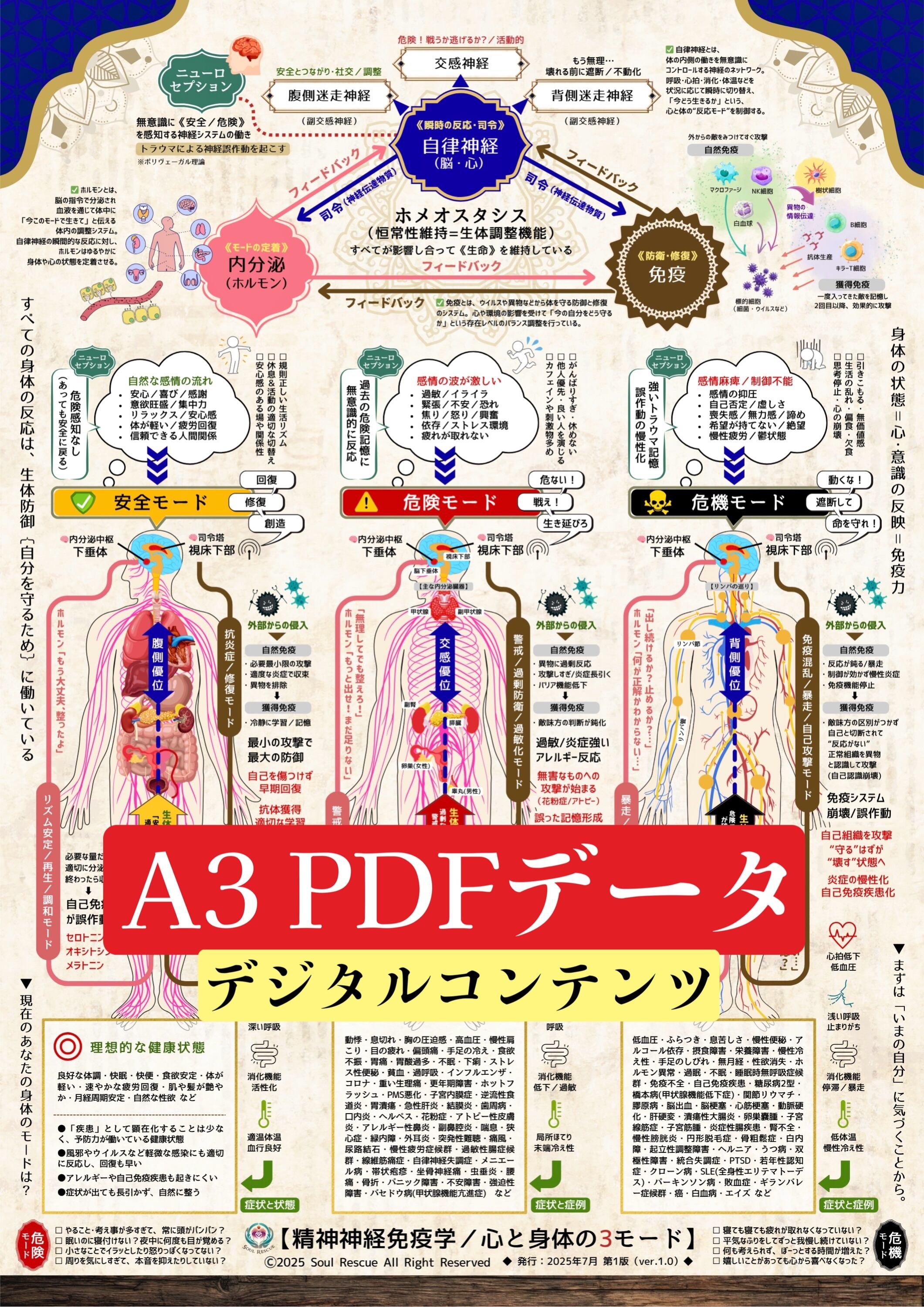 『心と身体の3モード』は、精神神経免疫学の神経・ホルモン・免疫システムのホメオスタシスの構造を基に、心と身体の3つのモードを視覚化したオリジナルポスターです。心の健康と身体のバランスを理解するための助けとなり、日常生活における体調管理やメンタルケア、自己理解の促進に役立ちます。いつでも見える場所に飾ることで、毎日の心身の状態を見つめなおすサポートを提供します。