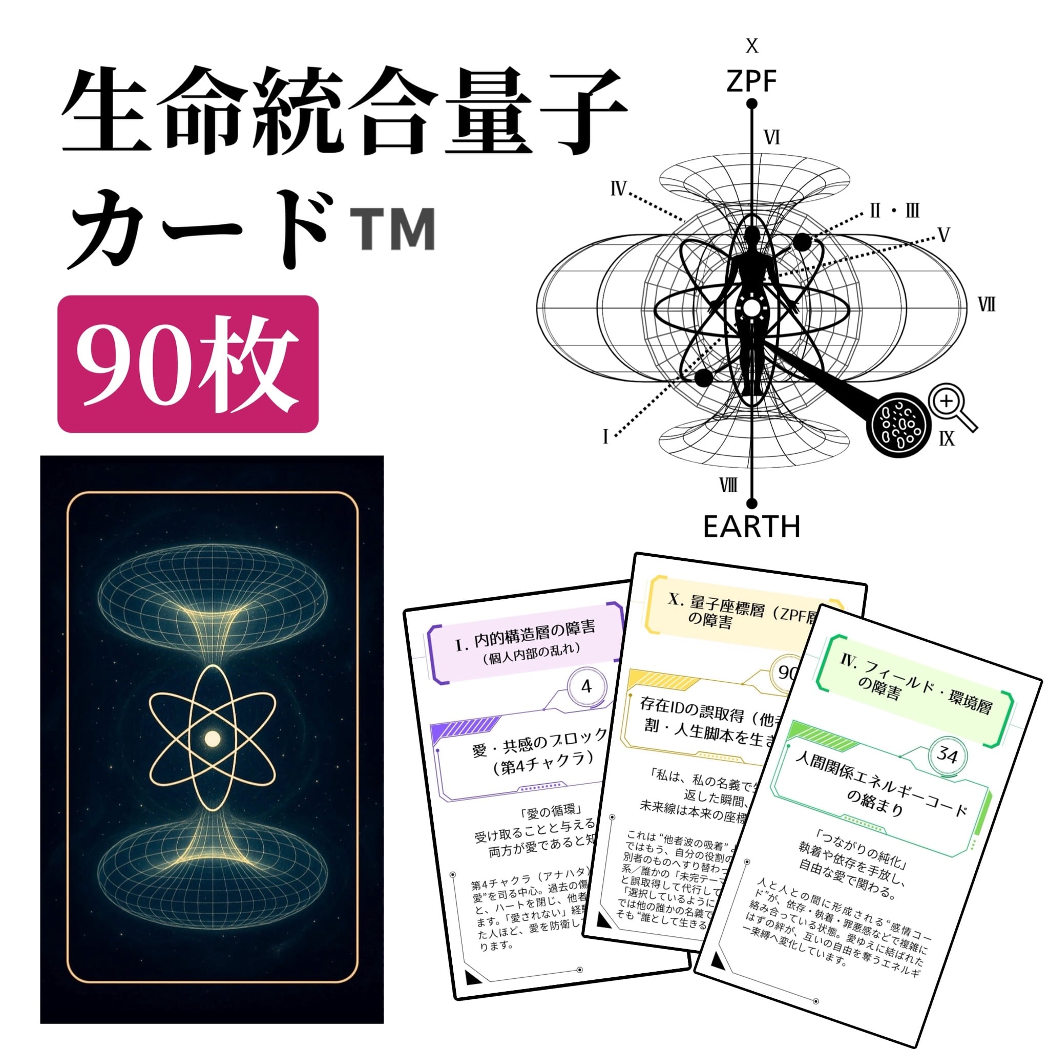 生命統合量子カード™ とは、90枚のカードがあなたの“量子的情報場”と共鳴し、生命構造のどの層に調整が必要かを可視化するエネルギー障害診断・共鳴デッキです。